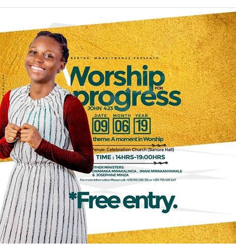 Mtumishi wa Mungu @bertha_mwakitwange anakukaribisha mahali hapa kesho kwenye Ibada ya WORSHIP FOR PROGRESS itakayofanyika kwenye ukumbi wa kanisa la Celebration Church (Banora Hall) hapa hapa jijini Dar es salaam.